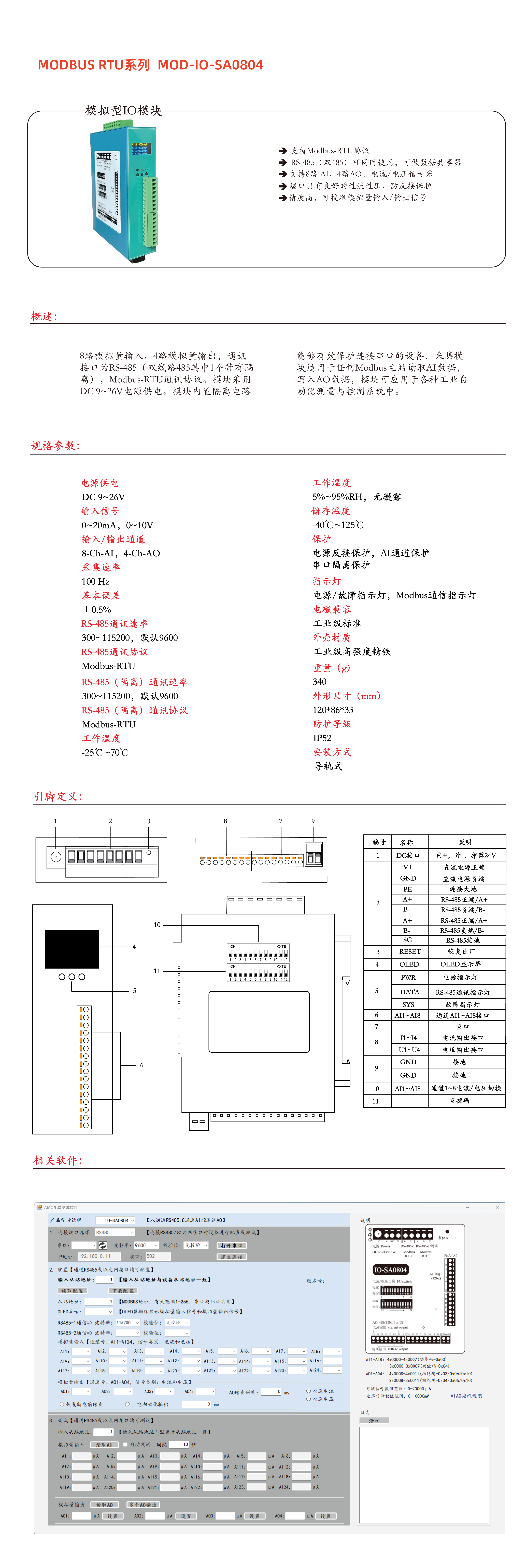 MOD-IO-SA0804 为8路模拟量输入、4路模拟量输出模块 ,通讯接口为RS-485/Modbus RTU通讯协议。模块采用DC9~26V电源供电。模块内置隔离电路能够有效保护连接串口的设备,采集模块适用于任何Modbus主站读取AI数据,写入AO数据,模块可应用于各种工业自动化测量与控制系统中。