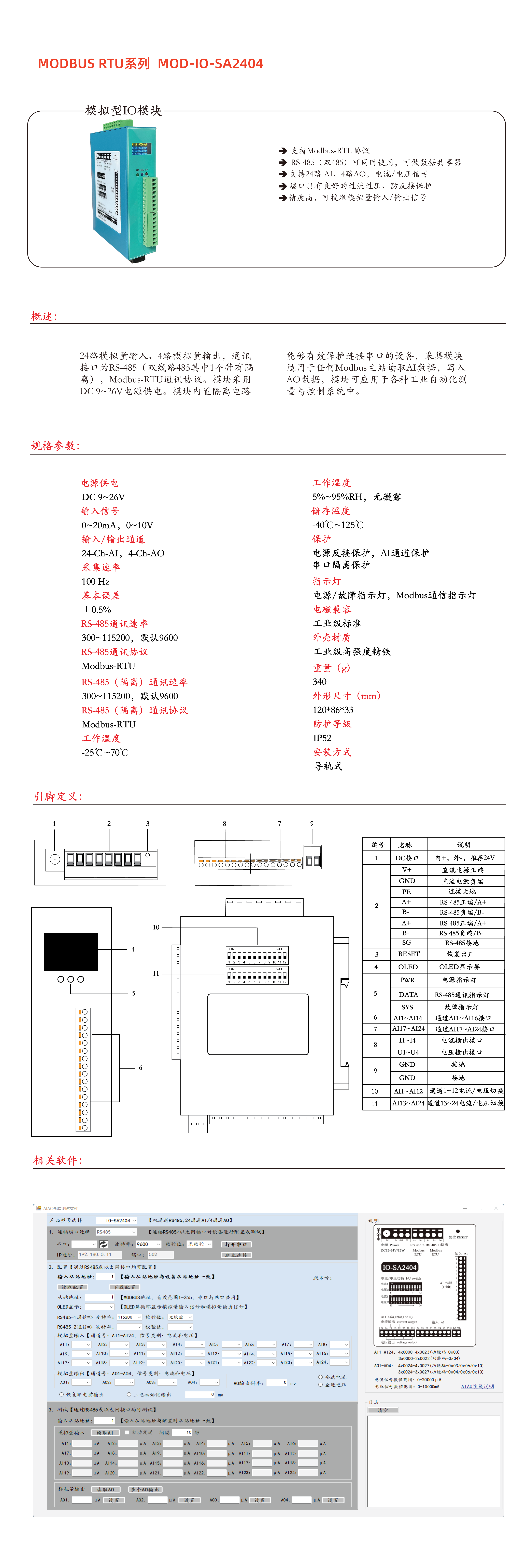MOD-IO-SA2404 为24路模拟量输入、4路模拟量输出模块 ,通讯接口为RS-485/Modbus RTU通讯协议。模块采用DC9~26V电源供电。模块内置隔离电路能够有效保护连接串口的设备,采集模块适用于任何Modbus主站读取AI数据,写入AO数据,模块可应用于各种工业自动化测量与控制系统中。